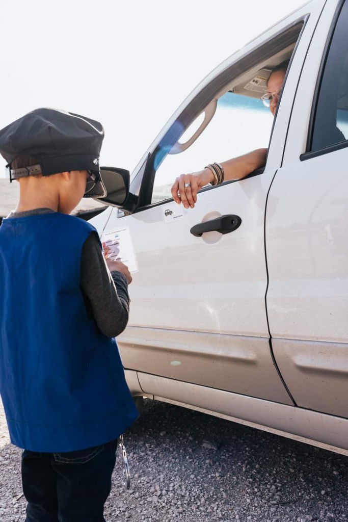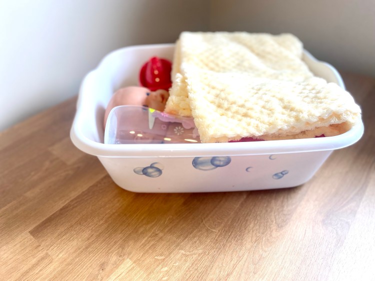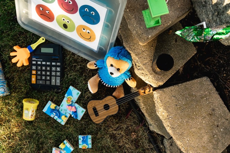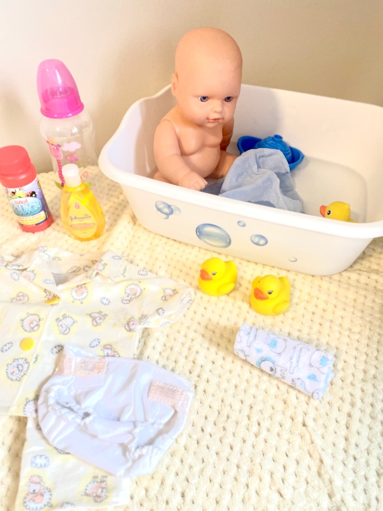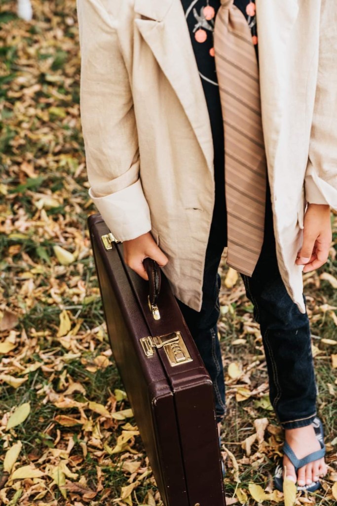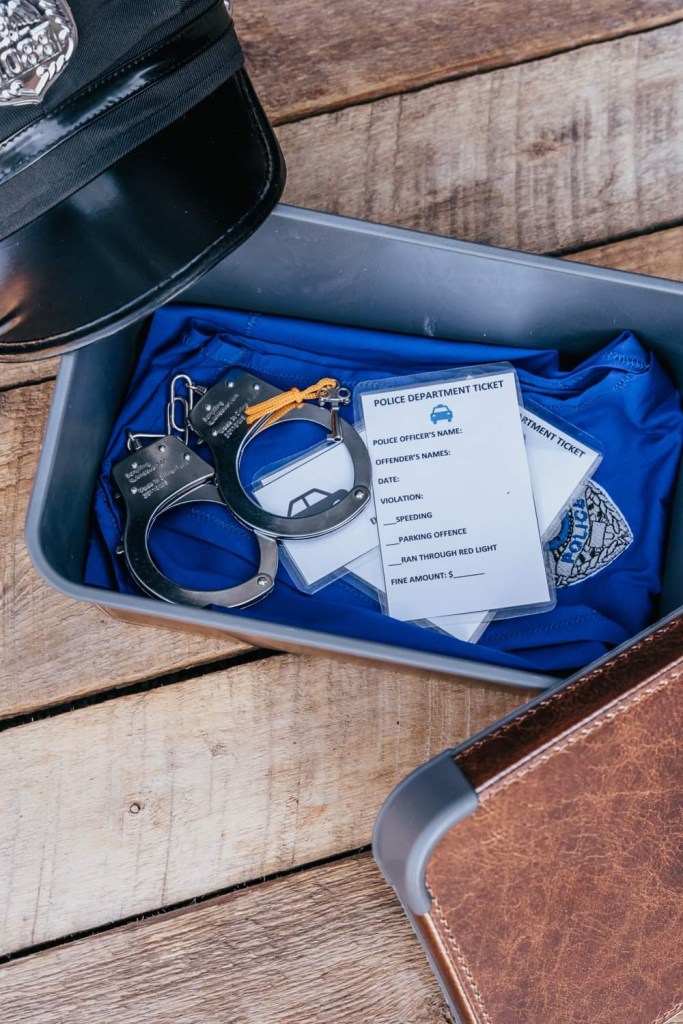 This little kit was simple to put together: a blue vest (sewn and embroidered by my mother), handcuffs, a pen, a police hat, traffic tickets, and a driver’s license. That’s all it took to spark hours of imaginative play. Just be careful not to litter around this police officer. I learned the hard way! I received a strict warning to clean up and was even issued a million dollar ticket for a traffic violation. Yikes!